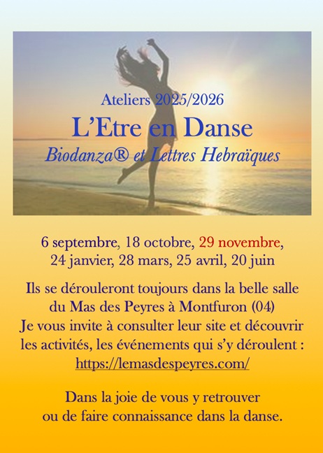 Ces ateliers s’appuient sur la méthodologie de la Biodanza intégrée au pouvoir symbolique des Lettres hébraïques, pour animer et fortifier en chacun les potentialités sacrées du vivant.